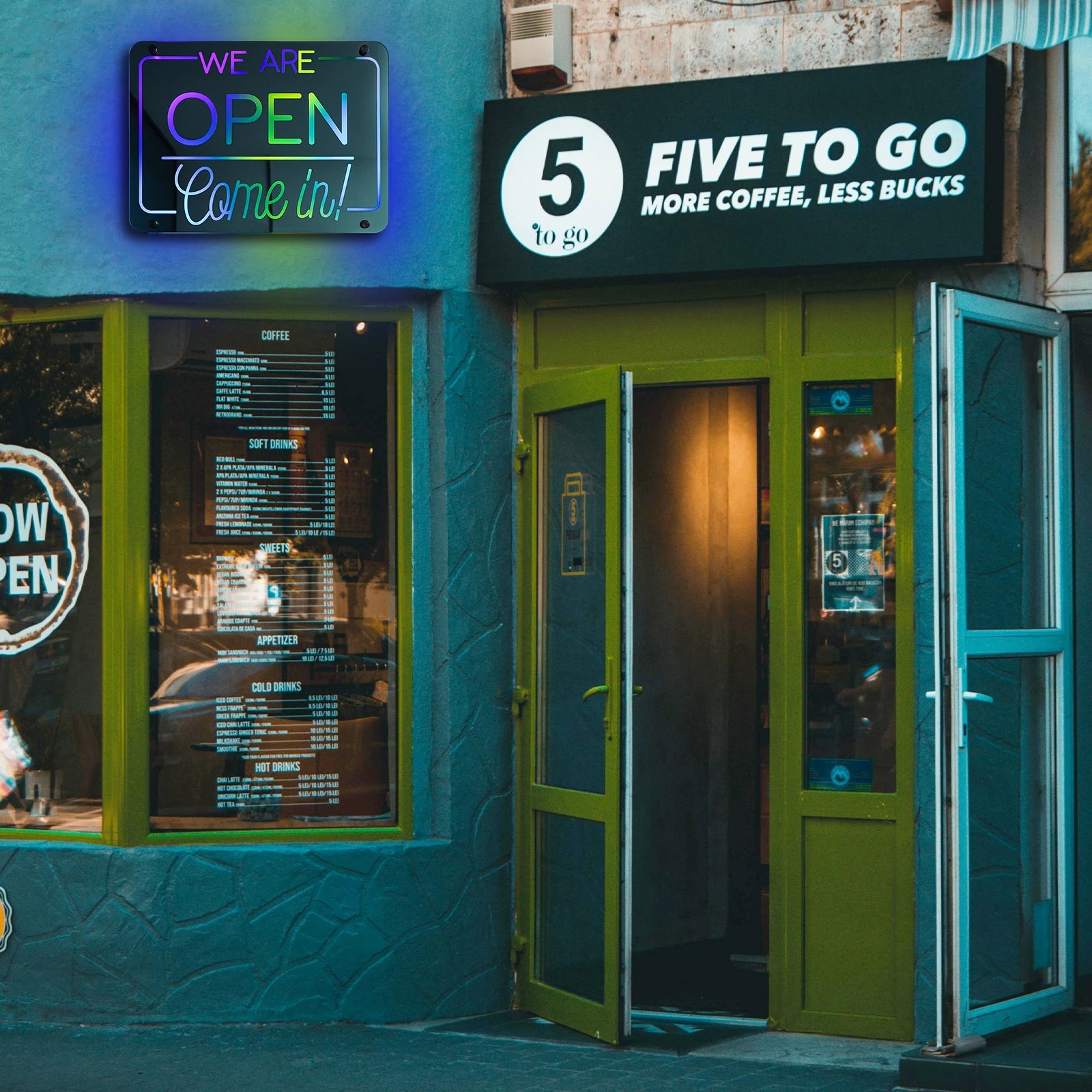 Transform your storefront and lure customers in with the ultimate "WE'RE OPEN - Come In" LED Sign. This isn't just any open sign; it's a mesmerizing **RGB infinity mirror** that creates a captivating visual tunnel effect, guaranteed to grab attention. Powered conveniently via USB, it offers a spectrum of vibrant colors and dynamic lighting modes to perfectly match your brand or mood.
