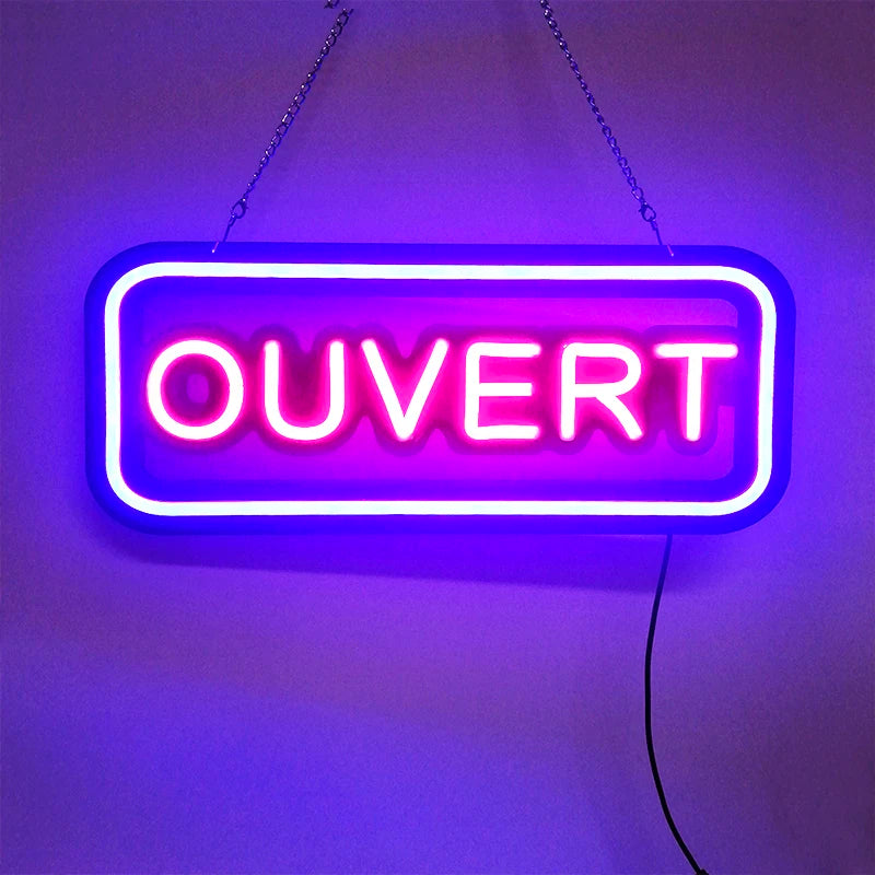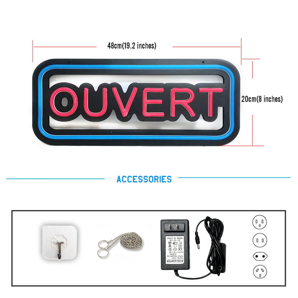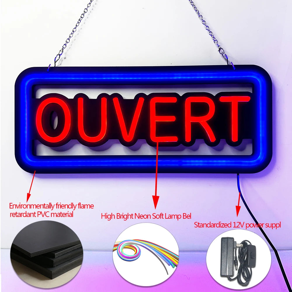 Make a clear and welcoming statement to your customers with our striking "Ouvert" LED open sign. Designed specifically for French-speaking markets, this vibrant sign ensures your business is noticed. Featuring dynamic red and blue illumination and a generous size of 48cm x 20cm, it's the perfect way to announce you're ready for business.